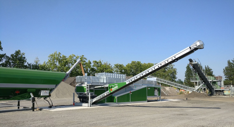 The material is loaded onto a tipper truck or a truck mixer by means of a height-adjustable conveyor belt.